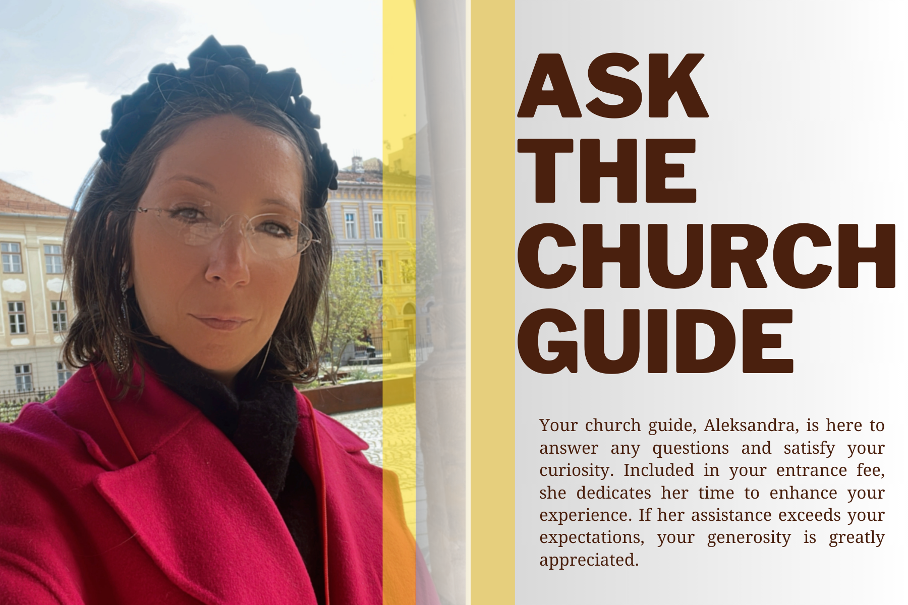 Seated at a small table inside the church, surrounded by notes, books, and ongoing research, I made myself visibly available to visitors who wished to go beyond a standard tour. The printed invitation in front of me simply read: Ask the Church Guide.