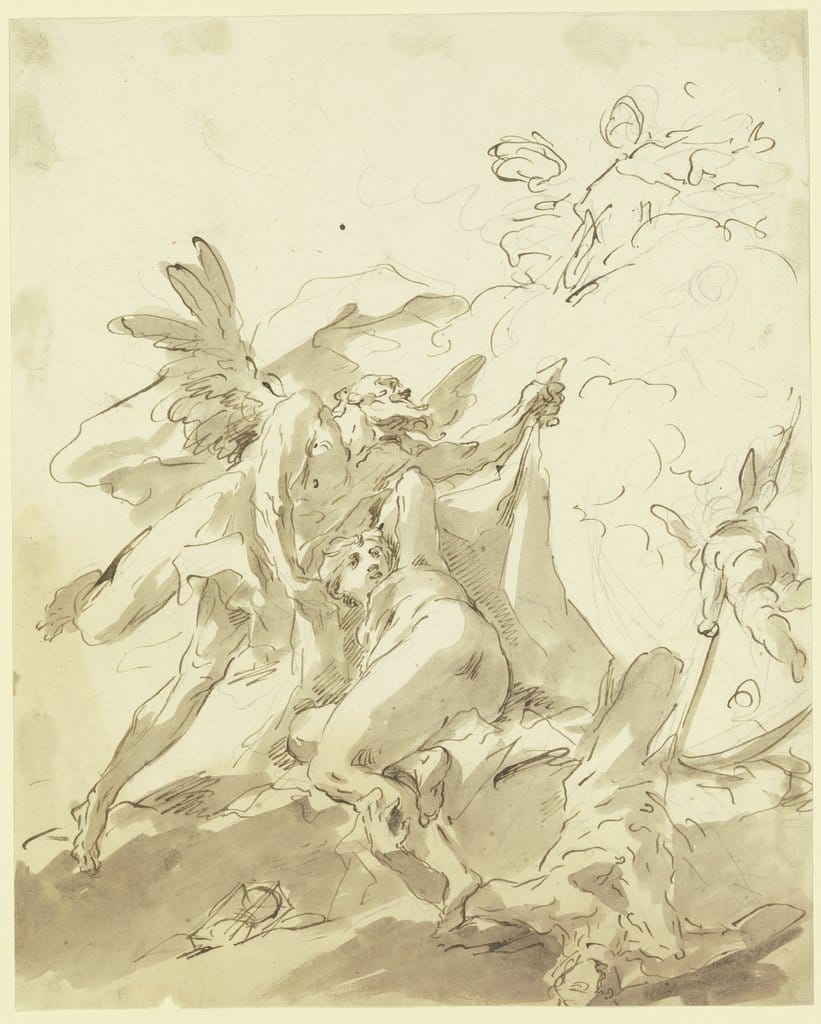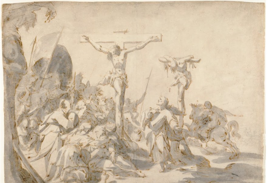 Österreich spricht hier mit der Stimme des Heilsdramas. Von Aachen, in Diensten großer Fürsten, wählte diesen feinen Karton wohl als Vorstudie zu einem größeren Altarwerk. In schwarzer Kreide vorbereitet, mit grau gewaschener Fläche modelliert, nutzt der Meister sodann das reine Weiß des Blattes für lichte Höhen und setzte zuletzt zarte Akzente mit brauner Tinte und feinem Pinsel. Durch diese sparsame, doch höchst theatralische Mittel entsteht eine Komposition von erhabener Dramatik und geistiger Weite — gleich einem Kirchenfenster, das sich dem frommen Blick öffnet.